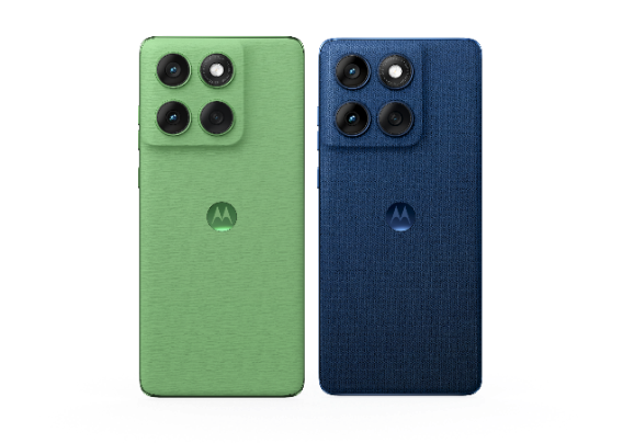 Motorola edge 60 oferuje wykończenia inspirowane płótnem i skórą, dostępne w odcieniach PANTONE Gibraltar Sea (niebieski) oraz PANTONE Shamrock (zielony).