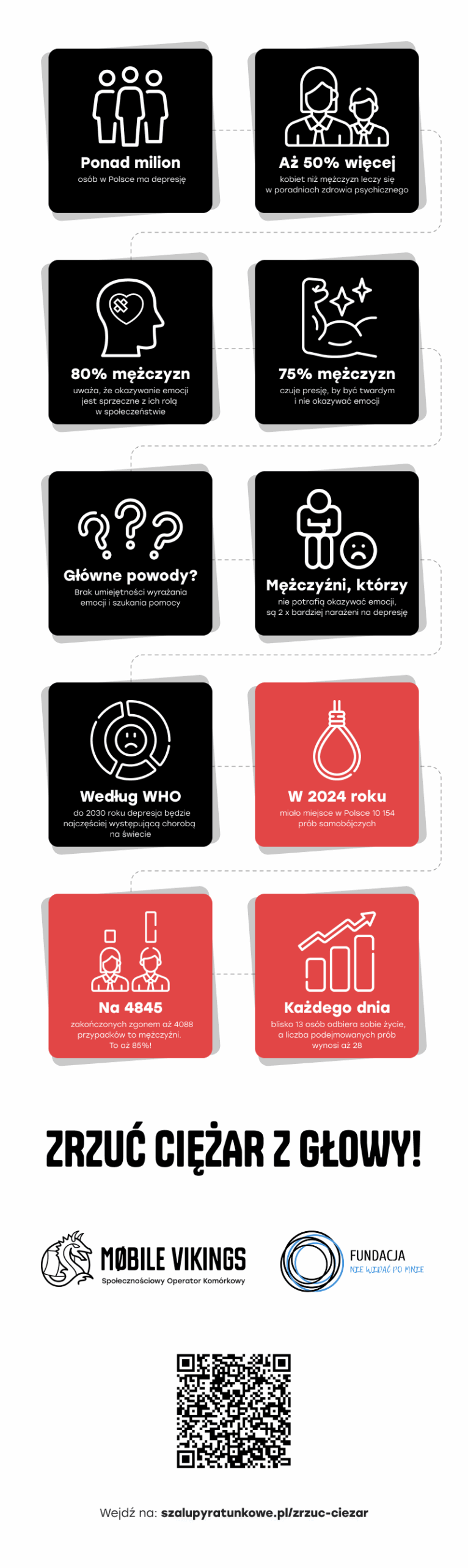 Społecznościowy operator komórkowy – Mobile Vikings – we współpracy z Fundacją Nie Widać Po Mnie startuje z kampanią społeczną Zrzuć ciężar z głowy. Jej głównym celem jest zwrócić uwagę na stygmatyzację depresji wśród mężczyzn. Mobile Vikings chce zachęcić również do rozmowy o emocjach oraz do skorzystania z pomocy psychologicznej. 23 kwietnia 2025 roku Mobile Vikings rozpoczął kampanię społeczną Zrzuć ciężar z głowy. Kampania adresowana jest do mężczyzn w wieku 25-45 lat, którzy zbyt mało uwagi poświęcają kwestii zdrowia psychicznego. Operator poprzez kampanię próbuje walczyć ze stereotypami kulturowo-płciowymi, według których mężczyzna nie powinien okazywać słabości.