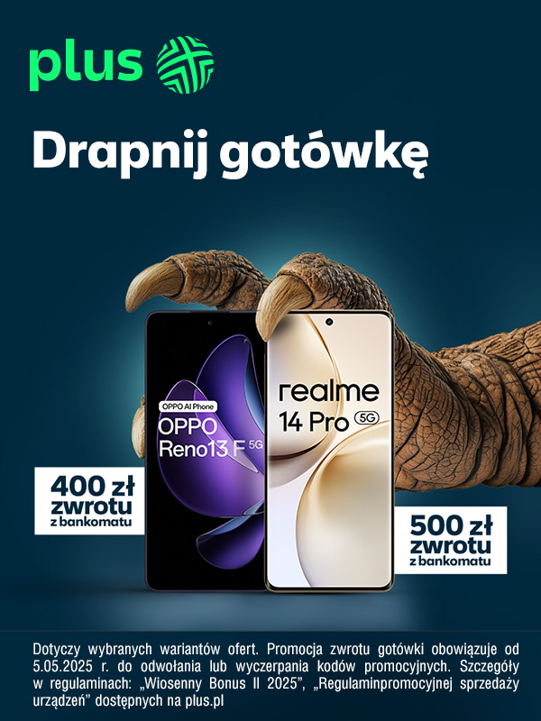 Zakup telefonu nie musi być dużym wydatkiem, ale trzeba znaleźć dobrą ofertę. Obecnie Plus oferuje swoim klientom zwrot nawet 500 zł gotówki z bankomatu. Ja to działa? Wystarczy kupić realme 14 Pro lub OPPO Reno 13 F 5G w dniach 5.05 – 1.06 i wysłać SMS. Następnie z otrzymanym potwierdzeniem zgłoszenia należy udać się do bankomatu Euronet i postępując zgodnie z otrzymaną instrukcją odebrać 500 zł w gotówce za zakup realme lub 400 zł przy zakupie OPPO. Oferta jest dostępna zarówno dla nowych jak i stałych klientów. Telefony można kupić wraz z abonamentem lub na raty 0%: