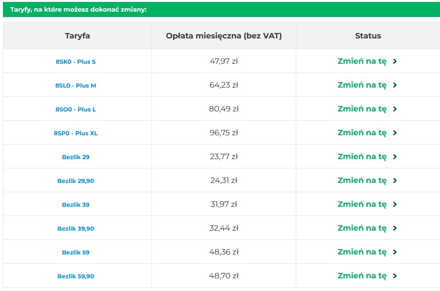 Pewnie kwestia zaniedbania i braku troski o to, aby funkcjonalność pełnej wersji webowej i mobilnej była tożsama. Po drugie – jeśli operator umożliwia zmianę planu taryfowego z poziomu aplikacji (choć – jak wspomnieliśmy – tylko w wersji webowej) – warto, aby klient wiedział, co otrzymuje? Tymczasem, jest wyłącznie możliwość wyboru planu taryfowego z listy, natomiast klient nie ma najmniejszej informacji o tym, co w danym planie taryfowym się znajduje?