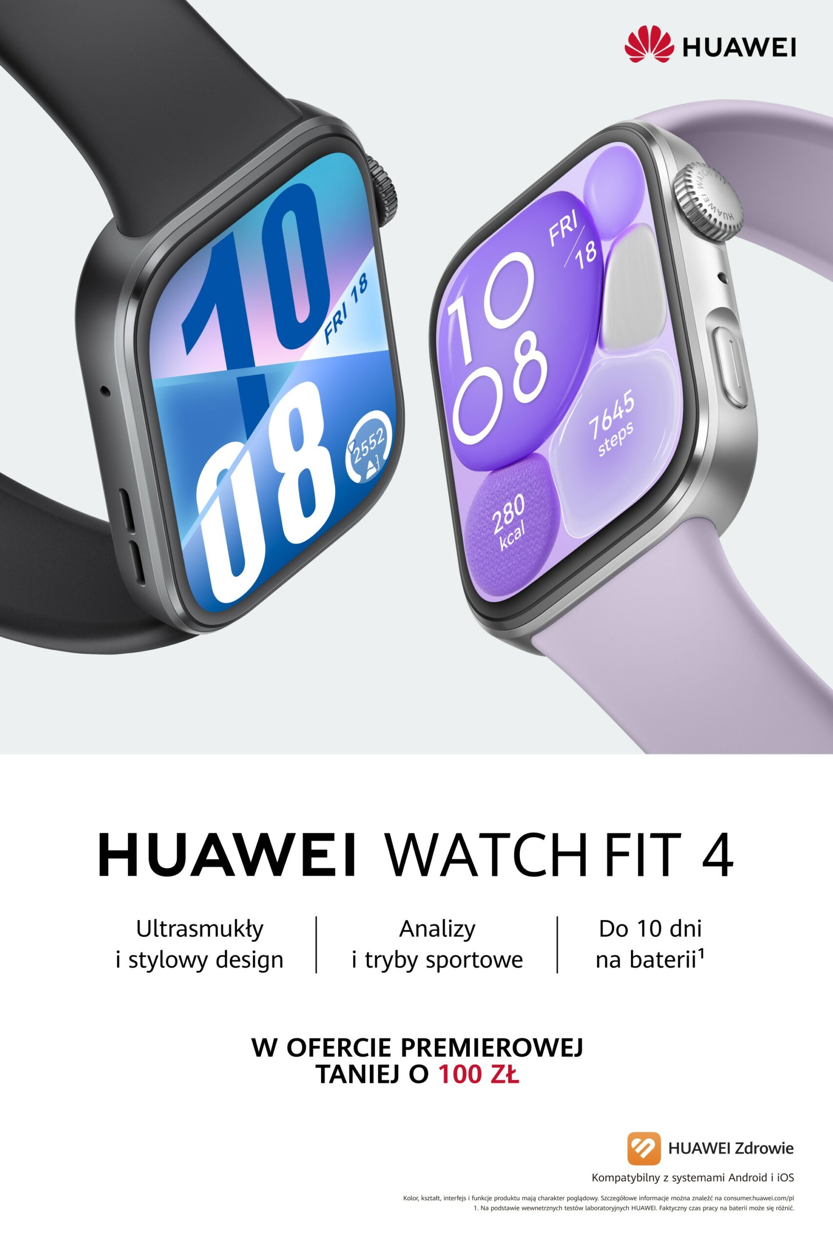 Rekomendowana cena detaliczne smartwatchy z serii WATCH FIT 4 wynosi 699 zł. W okresie od 15 maja do 29 czerwca 2025 r. trwa specjalna oferta premierowa, w ramach której rekomendowana cena zegarków z tej serii będzie obniżona o 100 zł, do 599 zł. Smartwatche będą dostępne u Partnerów Biznesowych: Media Expert, RTV Euro AGD, Media Markt, x-kom, Komputronik i Neonet oraz u operatorów sieci: Plus, T-Mobile, Orange i Play. Urządzenia można także kupić w sklepie huawei.pl oraz w oficjalnej Strefie Marki na Allegro. Klientów sklepu huawei.pl czeka powitalny bonus za zapisanie się na newsletter i możliwość dokupienia dodatkowego paska za 49 zł, przedłużenia gwarancji o dodatkowy rok o 50% taniej, czy rozłożenia płatności na raty. Podane ceny są cenami rekomendowanymi.