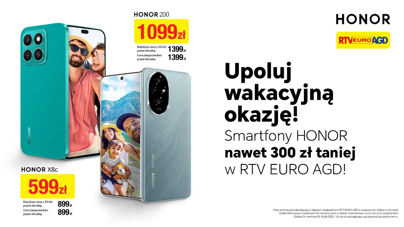 Warszawa, 4 czerwca 2025 – Marka HONOR zaprasza do skorzystania z wyjątkowej oferty promocyjnej na dwa innowacyjne modele smartfonów: HONOR 200 w cenie 1099 PLN oraz HONOR X8c w cenie 599 PLN. Oferta potrwa od 3 do 16 czerwca i będzie dostępna w sklepach stacjonarnych oraz online w RTV Euro AGD.