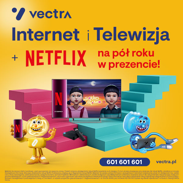 Vectra rozpoczęła czerwcową akcję promocyjną, w której Klienci mogą otrzymać 6-miesięczny dostęp do platformy Netflix w prezencie. W ramach kampanii, nawiązującej do premiery finałowego sezonu serialu „Squid Game” zaplanowanej na 27 czerwca br., operator przygotował dodatkowe atrakcje, w tym konkursy z nagrodami, specjalne aktywności w punktach sprzedaży oraz obecność promotorów w przestrzeni miejskiej. Nowe pakiety oferowane przez Vectrę umożliwiają Klientom skorzystanie z Planu Podstawowego Netflixa bez opłat przez pół roku. Oferta obejmuje różne kombinacje usług, w tym Internet o prędkości do 600 Mbit/s, pakiet telewizji „Złoty” (128 kanałów) oraz dekoder TV Smart 4K BOX. Klienci mogą skorzystać też z telewizji świadczonej za pomocą modułów CAM/dekodera HD w wariantach „Złoty” (128 kanałów) i „Platynowy” (167 kanałów), a także wybrać opcje z niższą prędkością Internetu. Po okresie promocyjnym dostęp do platformy Netflix wynosić będzie 33 zł miesięcznie w zobowiązaniu na 23 miesiące.