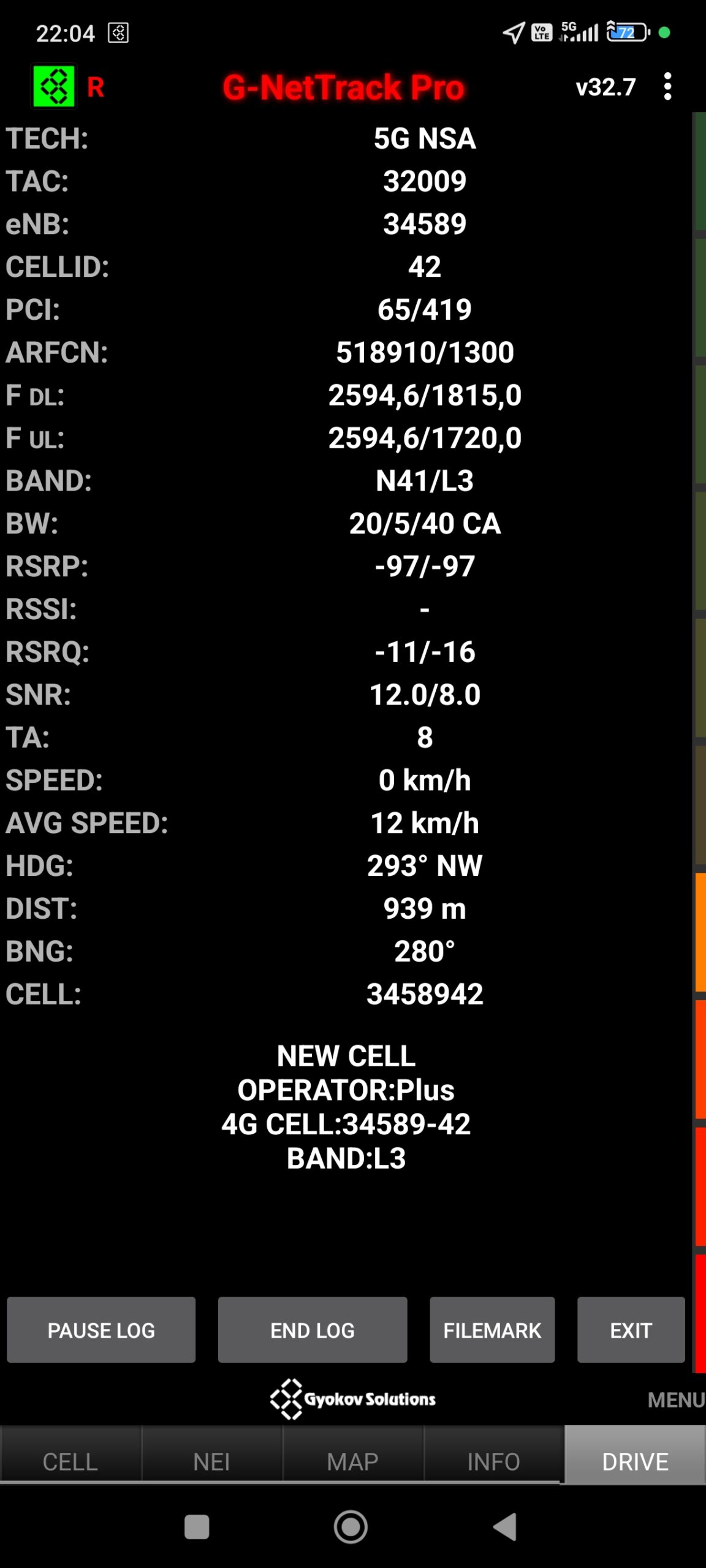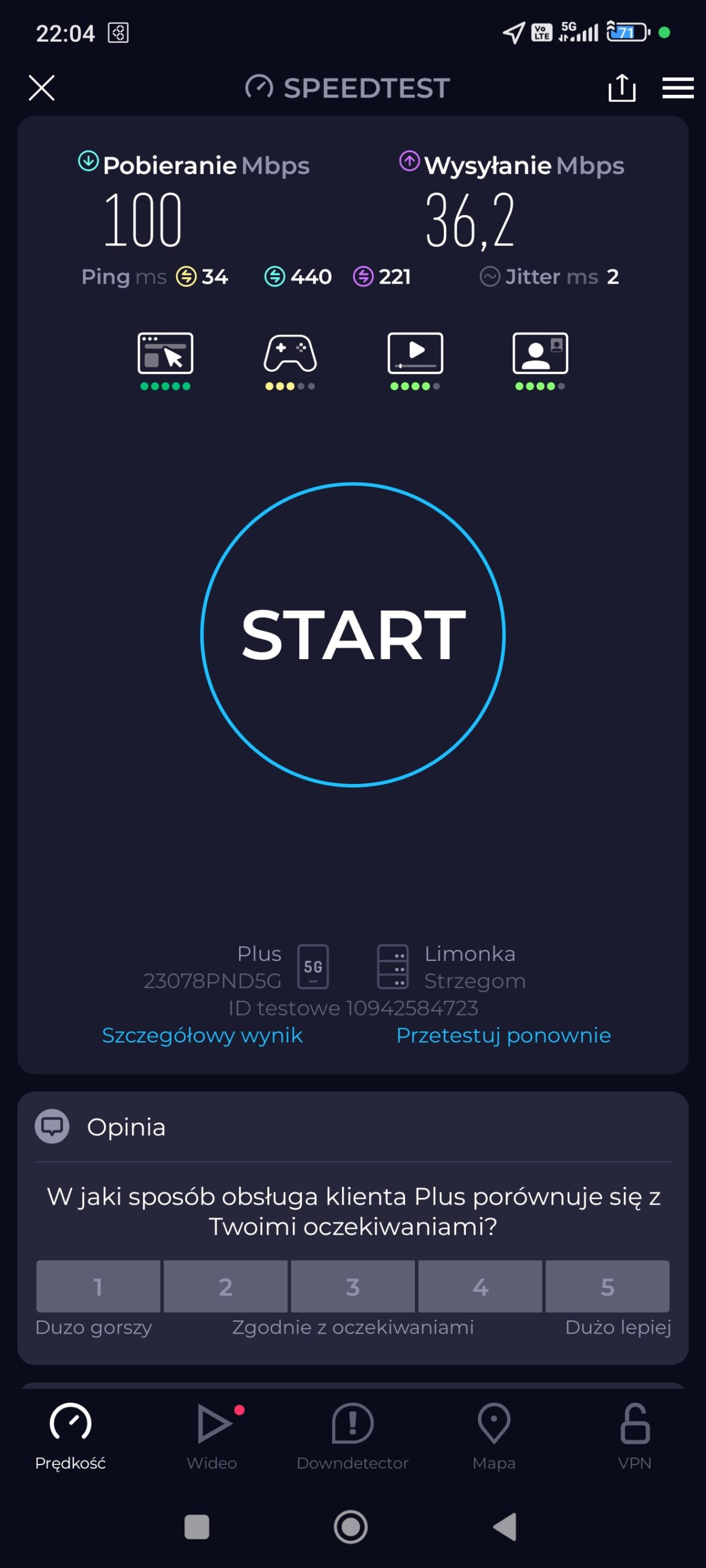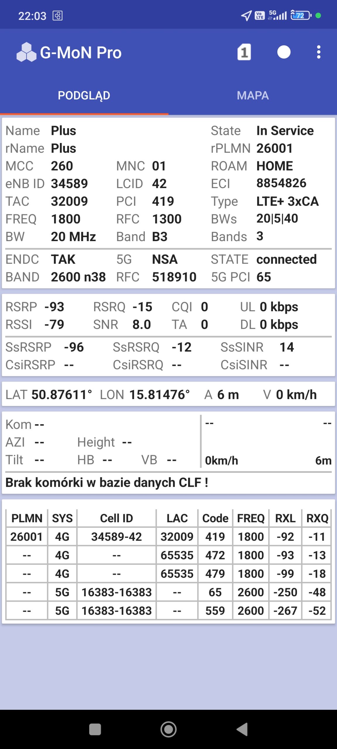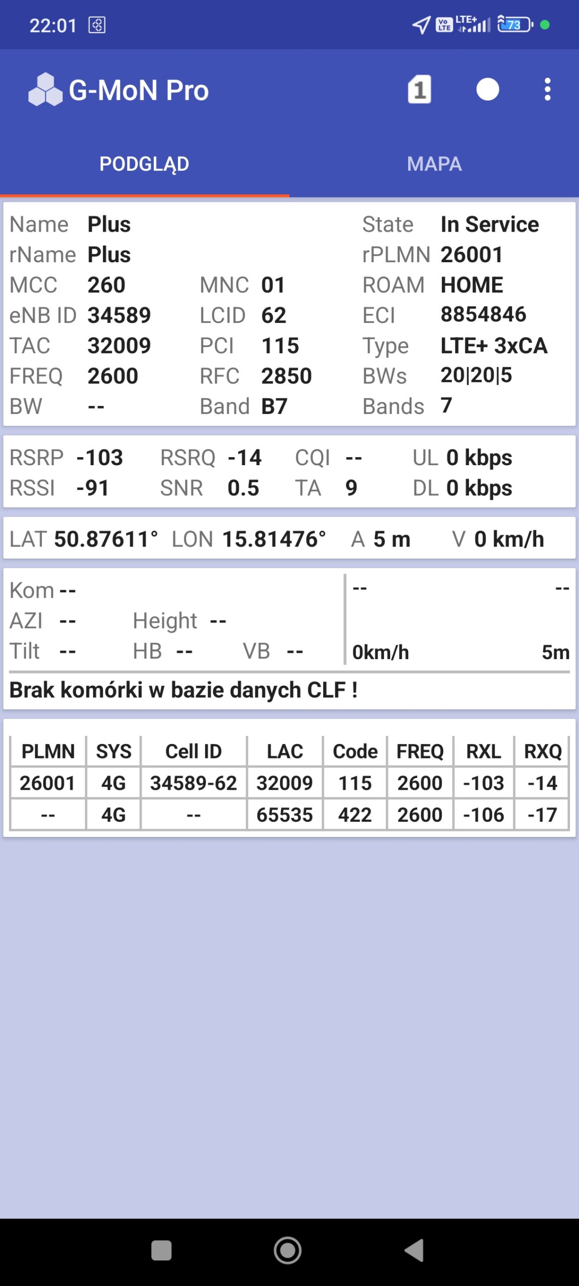 Poniżej to, co dziś otrzymujemy z nowej stacji Plusa w sąsiedztwie Pałacu Wojanów, gdzie dotąd terminal pokazywał informację „no signal” lub losowo i niestabilnie korzystał ze stacji w Dziwiszowie lub w Komarnie.
