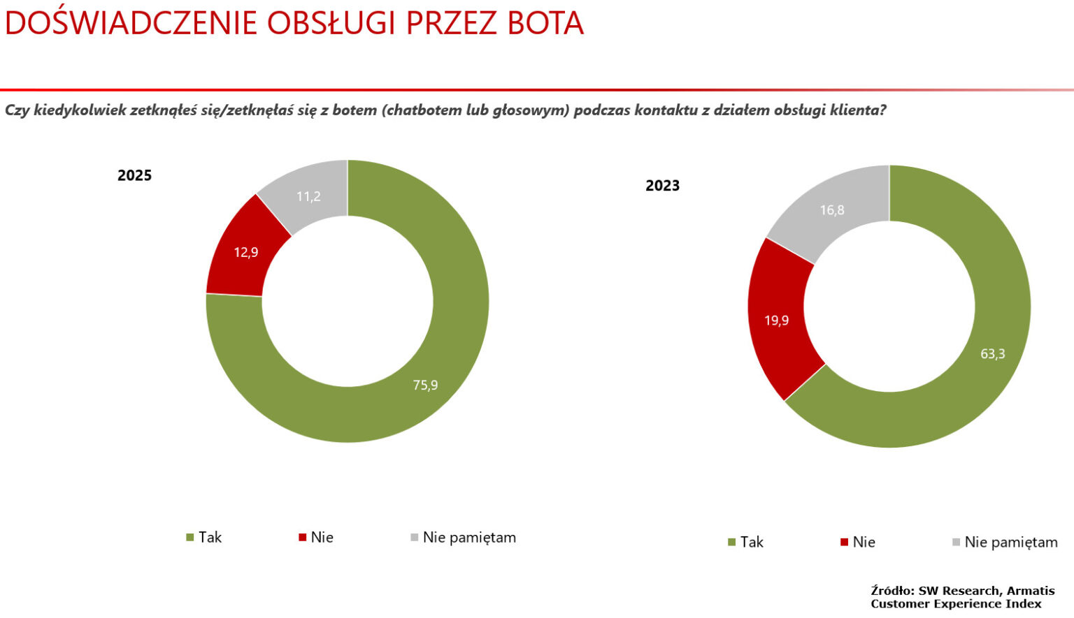 Ponad 3/4 Polaków (75,9%) miało już kontakt z botem w dziale obsługi klienta – to wzrost o ponad 12% w porównaniu z 2023 rokiem. Pozytywną zmianą jest też wzrost zadowolenia z obsługi przez boty. Obecnie niemal co czwarty Polak obsługiwany przez boty jest z tej obsługi zadowolony, co oznacza wzrost o 7.7% w ciągu dwóch ostatnich lat. Jednocześnie jednak tylko 8,1% Polaków w pełni ufa obsługującym ich botom – wynika z najnowszej edycji badań Armatis Customer Experience Index.