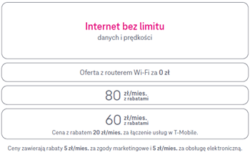 Dla klientów, którzy obecnie nie są w zasięgu światłowodu, również przygotowaliśmy uproszczoną ofertę nielimitowanego internetu domowego 5G. Usługa nie ma ograniczenia co do objętości danych ani szacunkowej prędkości maksymalnej przez cały czas obowiązywania umowy w tzw. „Strefie domowej”, a więc idealna do pracy, rozrywki i codziennego kontaktu z bliskimi. W ramach oferty za 80 zł miesięcznie (z rabatami) klienci otrzymują nowoczesny router Wi-Fi z anteną zewnętrzną, który zapewnia stabilne połączenie nawet w trudniejszych warunkach. Cena tego rozwiązania może być jeszcze niższa (60 zł miesięcznie z rabatami), jeśli internet domowy bez limitów będzie kolejną usługą, którą abonent posiada w T-Mobile. To rozwiązanie dla tych, którzy cenią prostotę, niezawodność i brak kompromisów.