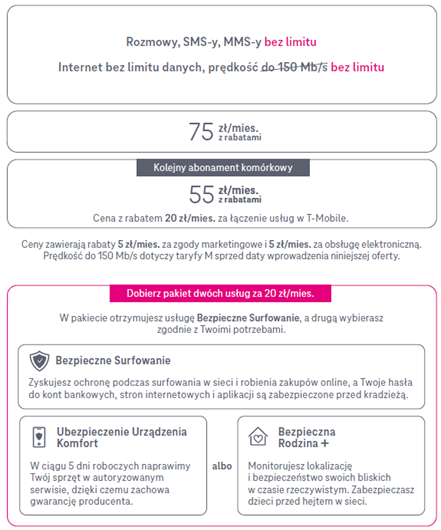 Bezpieczeństwo dla Ciebie, Twojej rodziny i Twojego sprzętu. Z T-Mobile jest nie tylko prosto, ale przede wszystkim bezpiecznie. Surfujesz w sieci? My czuwamy. Twój sprzęt się popsuł? Jesteśmy na posterunku. Troszczysz się o swoich bliskich? Dajemy Ci narzędzia, by ich chronić. Do nowej taryfy nielimitowanej możesz za 20 zł miesięcznie dobrać dwie usługi bezpieczeństwa: „Bezpieczne surfowanie” oraz do wyboru „Ubezpieczenie urządzenia Komfort” albo „Bezpieczna Rodzina+”.