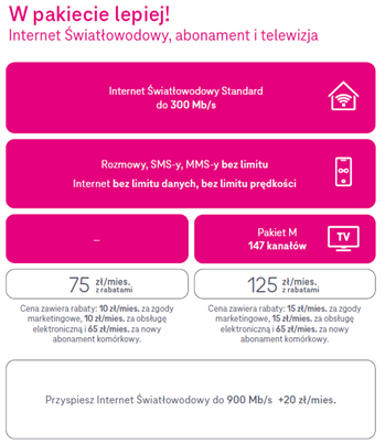 Oprócz nowej taryfy przygotowaliśmy także doskonałą ofertę pakietów usług dla domu. Widzimy wyraźnie, że zapotrzebowanie na łączenie usług jest coraz większe, bo obecnie ponad połowa nowych klientów T-Mobile, którzy decydują się na zakup internetu światłowodowego, wybierają go w pakiecie z abonamentem komórkowym. Od dziś decydując się na zestaw tych rozwiązań, użytkownik zapłaci jedynie 75 zł miesięcznie (z rabatami). Do tego pakietu można dołączyć również telewizję ze 147 kanałami – wówczas miesięczny koszt takiego zestawu będzie wynosić 125 zł (z rabatami). Użytkownik może również zwiększyć prędkość internetu światłowodowego do 900 Mb/s, dopłacając do zakupionego pakietu 20 zł miesięcznie.