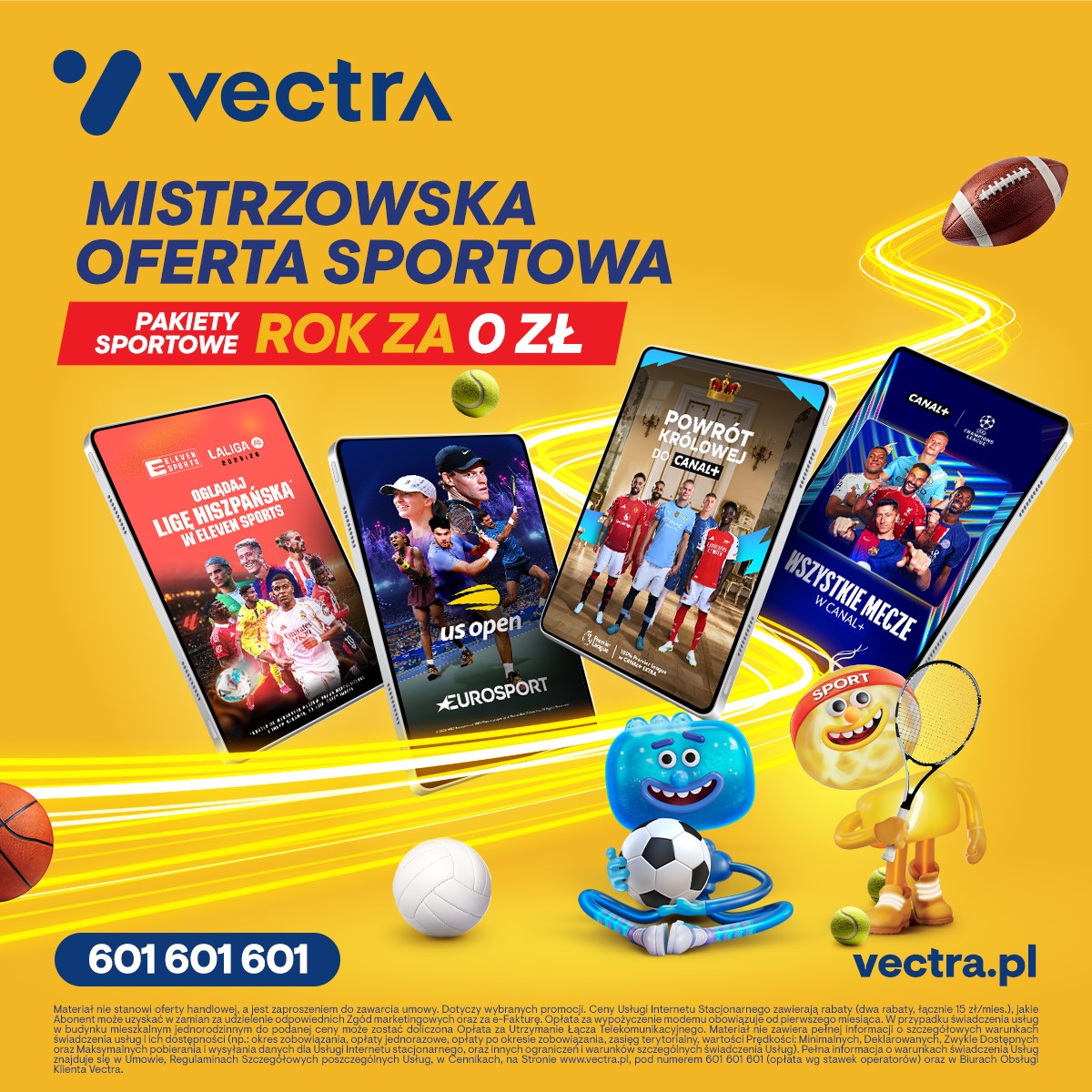 Główna promocja Vectry skierowana jest zarówno do fanów sportu, jak i osób poszukujących kompleksowej oferty w korzystnej cenie. Paczka z 23-miesięcznym okresem zobowiązania dostępna jest za 94,99 zł/mies. przez pierwsze 12 miesięcy, po czym opłata wzrasta do 134,99 zł/mies.: