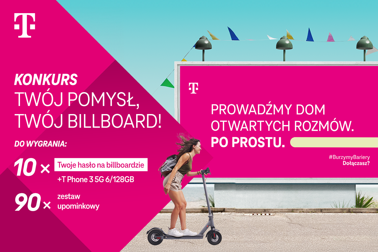 Zasady konkursu są proste – wystarczy wymyślić hasło, które odpowiada na pytanie: „Jaki jest Twój sposób na prostą komunikację w rodzinie” i przesłać je za pośrednictwem strony Burzymy bariery – konkurs T-Mobile | T-Mobile. 10 najlepszych zgłoszeń wyeksponujemy na billboardach w całej Polsce, a ich autorów nagrodzimy najnowszym T Phone 3 5G 6/128GB wraz z akcesoriami – etui i słuchawkami ANC TWE 220. To jednak nie koniec – twórcy 90 kolejnych zgłoszeń otrzymają od nas wyjątkowe zestawy upominkowe. – W T-Mobile lubimy wsłuchiwać się w to, co mają do powiedzenia nasi klienci. Na początku roku pytaliśmy ich o hasła zawierająca ciekawe sposoby na burzenie barier międzyludzkich. Pierwotnie na billboardach planowaliśmy umieścić trzy najciekawsze propozycje. Kreatywność uczestników jednak tak nas poruszyła, że ostatecznie pokazaliśmy na billboardach w całej Polsce aż dwadzieścia zgłoszeń. Jesteśmy przekonani, że i w tym przypadku nasi klienci pokażą drzemiącą w nich pomysłowość. Ciekawe, czym nas teraz zaskoczą – mówi Paulina Rekosz, Dyrektorka Departamentu Zarządzania Marką i Customer Experience.