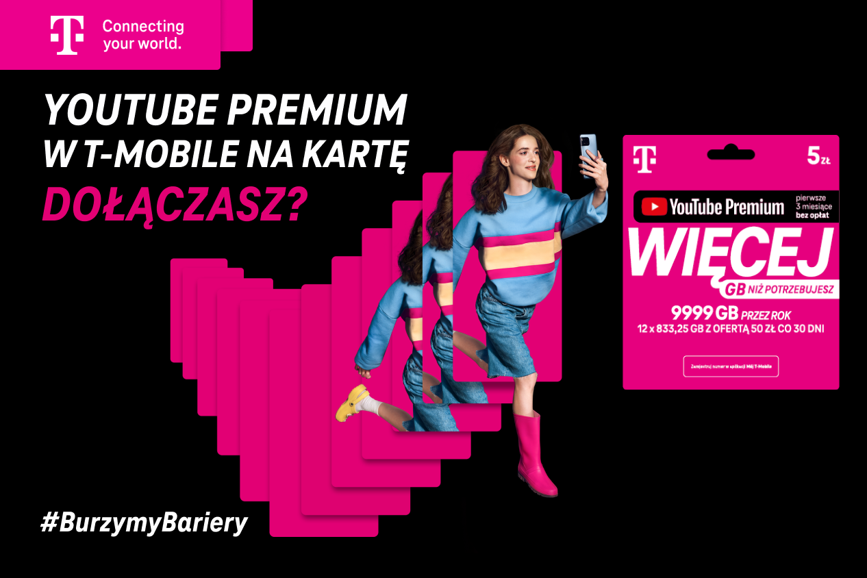 YouTube to miejsce pełne inspirujących treści, muzyki i filmów, które uwielbiamy oglądać bez końca. W T-Mobile zapewniamy najlepsze doświadczenia – chcemy więc, by nasi klienci mieli do nich jeszcze wygodniejszy dostęp. Dlatego przygotowaliśmy dla nich wyjątkową ofertę – teraz zarówno nowi, jak i obecni użytkownicy T-Mobile na kartę, mogą odebrać voucher nawet na 3 miesiące YouTube Premium bez opłat!