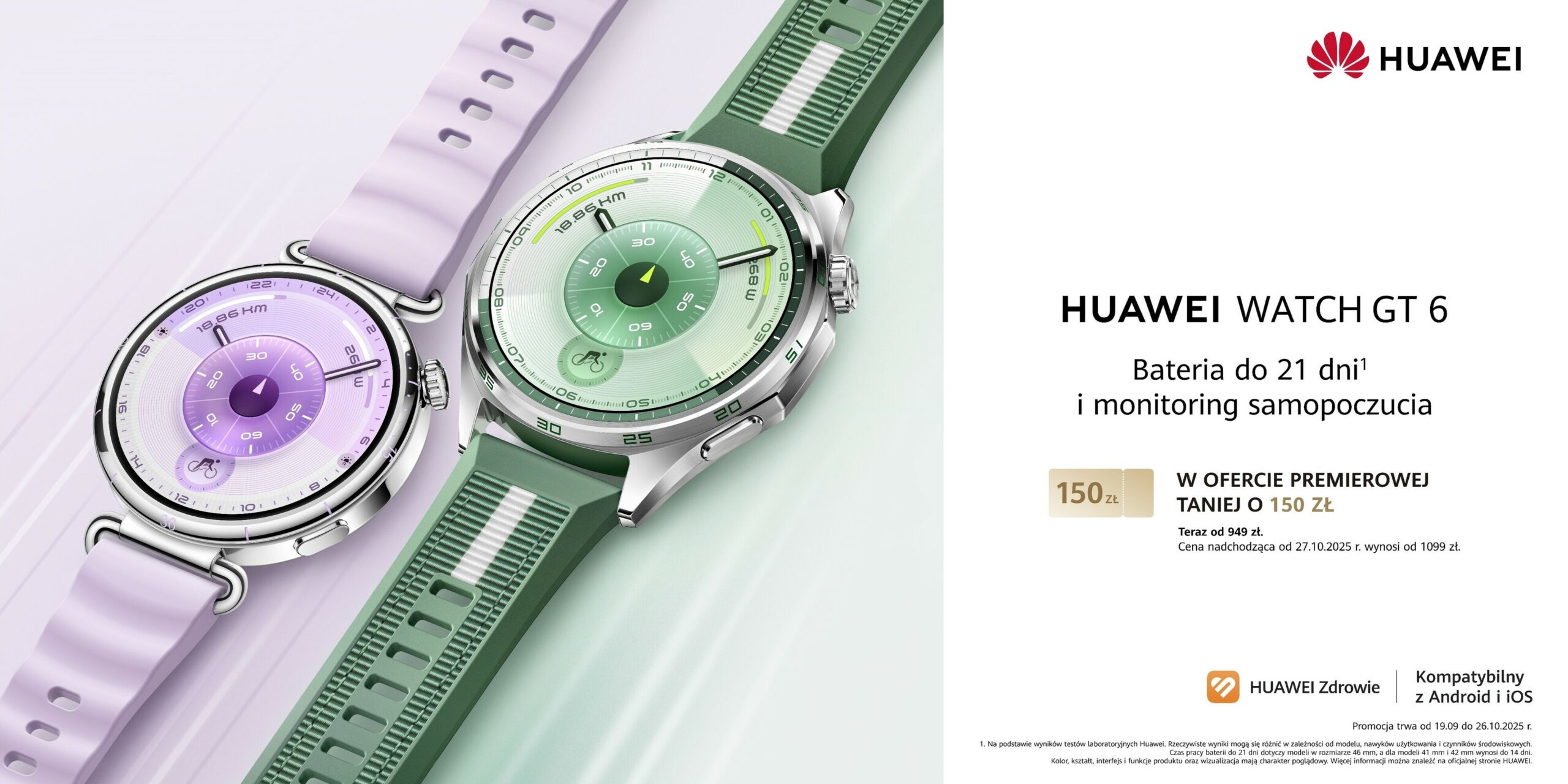 Warszawa, 19 września 2025 r. – Huawei wprowadza na polski rynek nową odsłonę popularnych smartwatchy HUAWEI WATCH GT. W szóstej generacji kupujący mają do wyboru modele podstawowe, czyli HUAWEI WATCH GT 6 oraz premium, czyli HUAWEI WATCH GT 6 Pro. Wszystkie łączą w sobie ponadczasową elegancję z rozbudowanymi funkcjami do pomiaru aktywności i samopoczucia. Największą zmianą, w porównaniu do poprzedniej serii, jest jeszcze lepszy czas pracy na jednym ładowaniu – w wersjach 46 mm wystarcza ona nawet na 21 dni pracy, a w mniejszych (41 mm) do 14 dni. W nowej generacji postawiono także na profesjonalny tryb kolarski, zwiększono jasność ekranu i dokładność pozycjonowania, a także rozszerzono możliwości pomiaru samopoczucia – od analizy fali tętna po monitorowanie 12 różnych nastrojów. Zegarki można połączyć z dowolnym smartfonem, niezależnie czy jest to Android, czy iOS. A jakby tego było mało obsługują także płatności zbliżeniowe.