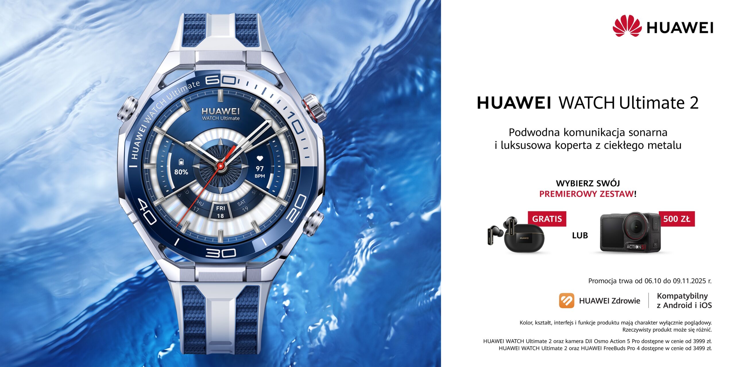 Warszawa, 6 października 2025 r. – Na polskim rynku pojawił się długo wyczekiwany HUAWEI WATCH Ultimate 2, który łączy ekskluzywny design z wysoką funkcjonalnością. Koperta z płynnego metalu na bazie cyrkonu, nanoceramiczny bezel i ultrajasny ekran ze szkła szafirowego gwarantują ekstremalną odporność na uszkodzenia. Z zegarkiem można nurkować nawet do 150 metrów, a nowością, która nie była obecna w poprzedniej generacji, jest komunikacja sonarowa, umożliwiająca porozumiewanie się z partnerami nurkowymi pod wodą, bez konieczności użycia gestów czy sygnałów świetlnych. Do tego smartwatch został wyposażony w precyzyjny GPS, rozbudowane funkcje zdrowotne, połączenia eSIM bez użycia telefonu oraz płatności zbliżeniowe. HUAWEI WATCH Ultimate 2 można sparować zarówno z urządzeniami z systemem Android, jak i iOS.