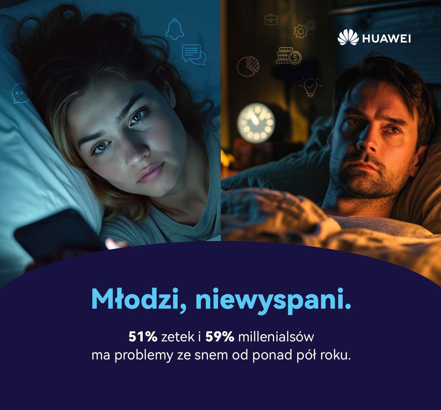 Warszawa, 24 października 2025 r. – W nocy z soboty 25 na niedzielę 26 października cofniemy zegarki i – przynajmniej w teorii – pośpimy o godzinę dłużej. Dla wielu z nas będzie to jednak tylko pozorna ulga. Jak pokazuje badanie Huawei CBG Polska, ponad 25% Polaków źle znosi zmianę czasu, a niemal połowa (47%) ma trudności z przestawieniem rytmu snu [1]. Dodatkowa godzina w łóżku nie wystarczy, by nadrobić chroniczne zmęczenie, z którym zmagają się zwłaszcza młodzi dorośli. Generacje Z i Y, mimo dzielących je różnic, łączy wspólne wyzwanie: zaburzona higiena snu i brak odpowiedniej regeneracji. Co 3 (34%) przedstawiciel pokolenia Z śpi nie dłużej niż 6 godzin na dobę, a niemal połowa millenialsów (45%) deklarujących problemy ze snem ma je od ponad roku [2][3]. To jednak tylko wierzchołek góry lodowej. Oba pokolenia zasypiają o nieregularnych porach, mają trudności z porannym funkcjonowaniem i sięgają po ekrany tuż przed snem. Kim są millenialsi (tzw. pokolenie Y) i zetki? Nie istnieje jednoznaczna, powszechnie przyjęta definicja tych dwóch grup demograficznych, jednak przyjmuje się, że generacja Y to osoby urodzone w przybliżeniu między 1981 a 1995 rokiem, natomiast pokolenie Z obejmuje osoby urodzone od 1996 do 2012 roku [4]. Jesień to okres, w którym dni stają się coraz krótsze, doświadczamy mniejszej ekspozycji na słońce, a zmiana czasu na zimowy dodatkowo wpływa na nasz rytm dobowy. To dobry moment, by przyjrzeć się jakości i higienie snu młodych pokoleń, a także temu, jak codzienne nawyki wpływają na ich regenerację.
