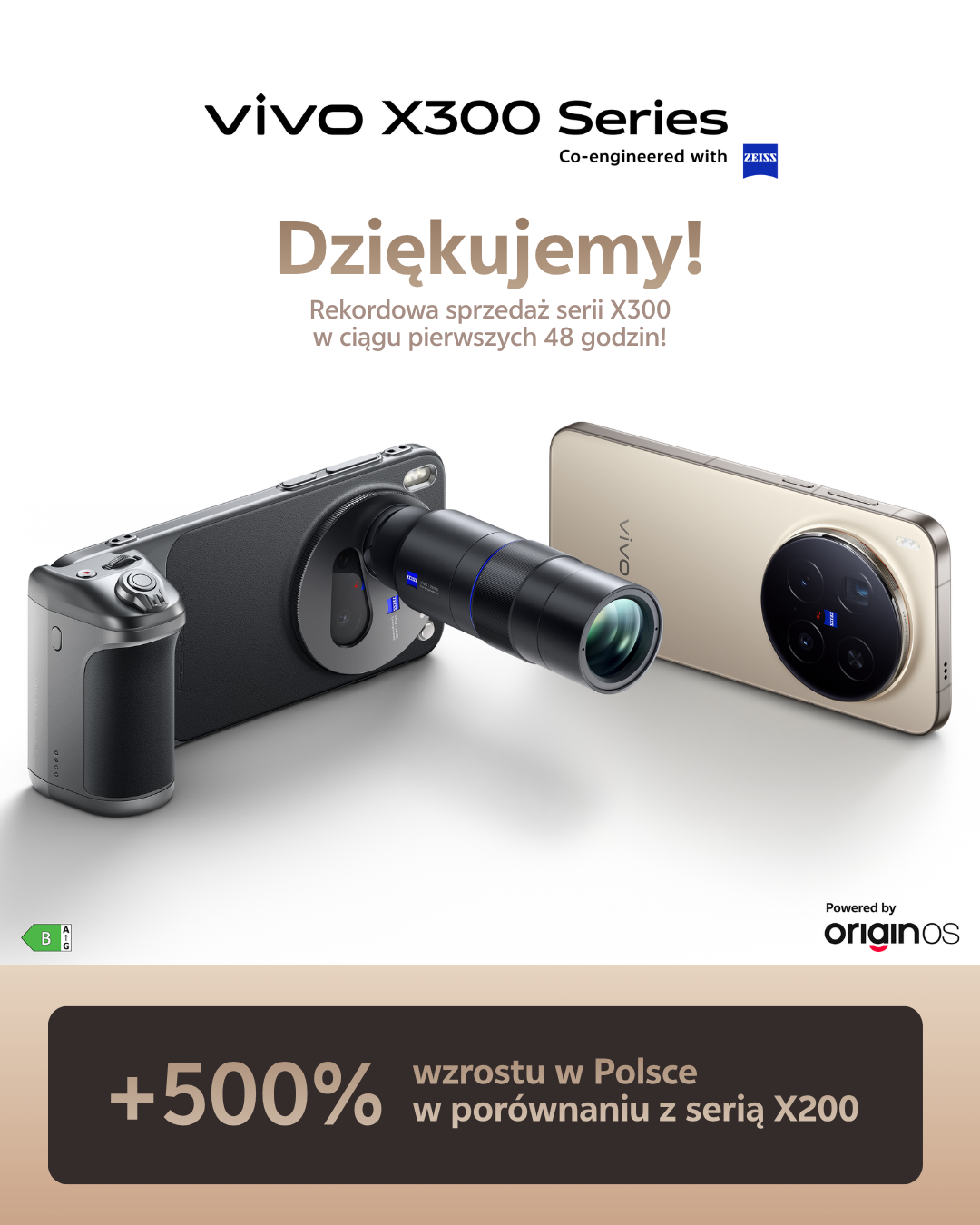 Seria fotograficznych smartfonów vivo X300 cieszy się ogromnym zainteresowaniem w całej Europie – a w Polsce szczególnie. W ciągu pierwszych 48 godzin od startu sprzedaży nowe modele odnotowały ponad 500% wzrost sprzedaży w porównaniu z serią X200. To wynik, który potwierdza rosnącą pozycję marki vivo w segmencie premium na polskim rynku. Tak duże zainteresowanie to efekt połączenia nowatorskiej technologii fotograficznej z atrakcyjną premierową ofertą w Media Expert. Smartfony vivo X300 i X300 Pro dostępne są w zestawach ze słuchawkami vivo TWS 3e i szybką ładowarką 90W, z rabatami sięgającymi nawet 500 zł.