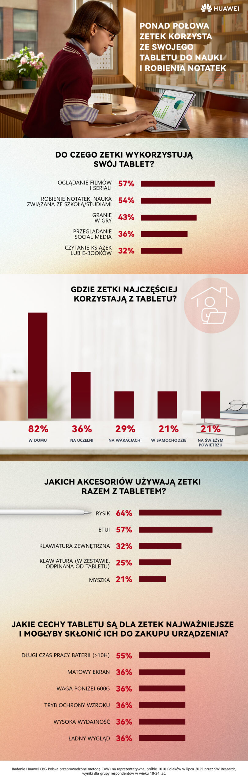 Warszawa, 31 grudnia 2025 r. – W obliczu zbliżającej się zimowej sesji na uczelniach oraz półrocznych zaliczeń w szkołach rośnie znaczenie technologii, która wspiera organizację i efektywność nauki. Z  badania Huawei CBG Polska wynika, że 35% młodych Polaków korzysta z tabletu średnio przez co najmniej godzinę dziennie [i]. Ponad połowa osób z pokolenia Z [ii] (54%) wykorzystuje urządzenie do nauki i robienia notatek, a niemal co trzecia (32%) czyta na nim książki i e-booki [iii]. Dzięki swojej mobilności, lekkości i wszechstronności, tablety stają się naturalnym wyborem dla młodych, którzy cenią sobie wygodę. W kolejnych tygodniach dla wielu młodych Polaków rozpocznie się intensywny okres przygotowań do egzaminów i zaliczeń. Nauka odbywa się dziś w najróżniejszych miejscach: w bibliotekach, w domu, w komunikacji miejskiej, w akademiku czy w kawiarni. Zetki stawiają wtedy na wygodę – badanie Huawei CBG Polska pokazuje, że 30% osób w wieku 18-24 posiada tablet i aktywnie z niego korzysta, a kolejne 12% planuje zakup tego urządzenia w najbliższym czasie. Co istotne, ponad połowa młodych użytkowników (53%) dysponuje stosunkowo nowym sprzętem – nie starszym niż trzy lata. Młodzi coraz częściej sięgają po tablet, który jest lekki i poręczny, a jednocześnie wystarczająco wszechstronny, by zastąpić tradycyjne zeszyty, podręczniki i laptopa. Tablet to dla młodych nie tylko urządzenie do rozrywki, ale także notatnik, czytnik e-booków oraz narzędzie do kreatywnej edukacji. – Dla pokolenia Z technologia nie jest dodatkowym narzędziem, lecz naturalnym środowiskiem, w którym funkcjonują od najmłodszych lat. Pracując ze studentami zauważam, że tablety są coraz częściej wykorzystywane i – w przeciwieństwie do laptopa – zajmują mniej miejsca na często niewielkich pulpitach w salach dydaktycznych. Tablet ułatwia przemieszczanie się po sali, co sprzyja też bardziej interaktywnym formom nauczania. Jednak największym wyzwaniem dla Pokolenia Z nie jest obsługa technologii, ale zarządzanie swoją uwagą. Aby technologia rzeczywiście usprawniała edukację, studenci powinni zwracać uwagę na świadome strategie samoregulacyjne, ale też korzystać np. z trybów skupienia czy blokowania aplikacji rozpraszających – mówi Joanna Szen-Ziemiańska – doktor psychologii i psychopedagog specjalizująca się we wspieraniu rozwoju, edukacji i twórczości. Wykładowczyni akademicka i psychoterapeutka w trakcie szkolenia poznawczo-behawioralnego.