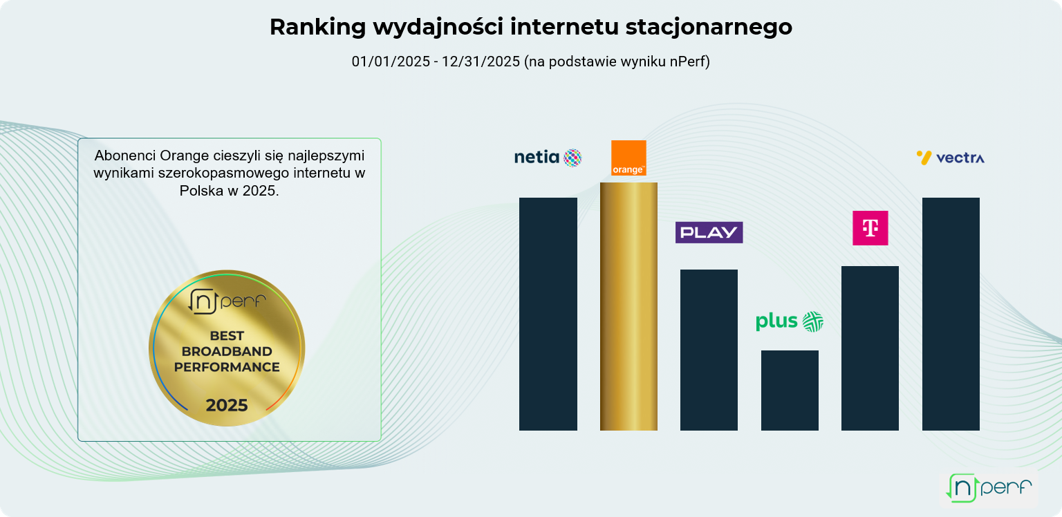 Orange jest liderem stacjonarnego Internetu w Polsce w roku 2025, zgodnie z corocznym barometrem nPerf. Ta edycja ujawnia silną konkurencję w metrykach technicznych z trzema operatorami blisko siebie w czołówce rankingu. Orange zajmuje pierwsze miejsce z wynikiem 124 370 nPoints i dominuje w prędkości pobierania z 319,3 Mbps, idealnej do strumieniowania HD. Z prędkościami 129,4 Mbps w wysyłaniu i 26,9 ms w opóźnieniu, operator zajmuje drugie miejsce w obu metrykach. Lider w WiFi i FTTH, dzieli pierwsze miejsce ex-aequo w strumieniowaniu wideo (81,5%) i zapewnia zrównoważone doświadczenie użytkownika we wszystkich technologiach. Vectra plasuje się na drugim miejscu z 118 590 nPoints i prowadzi w przeglądaniu z 79,9%, zapewniając efektywną nawigację internetową. Operator dzieli pierwsze miejsce ex-aequo w strumieniowaniu wideo (81,7%) i wykazuje solidne wyniki w prędkości pobierania (264,1 Mbps, drugie miejsce). Netia uzupełnia podium z 118 549 nPoints i osiąga najlepsze opóźnienie w sektorze (26,8 ms), idealne do gier online i komunikacji w czasie rzeczywistym. Operator prowadzi w prędkości wysyłania z 157,0 Mbps, gwarantując jakość wideokonferencji, i zajmuje drugie miejsce w prędkości pobierania (279,2 Mbps). T-Mobile zajmuje czwarte miejsce z 92 771 nPoints. Operator wykazuje solidne wyniki we wszystkich wskaźnikach ze zrównoważonymi metrykami do codziennego użytku. Play plasuje się na piątym miejscu z 91 285 nPoints i utrzymuje konkurencyjne wyniki w prędkości pobierania (139,7 Mbps). Plus zajmuje szóste miejsce z 60 730 nPoints i utrzymuje stabilną pozycję w sektorze. Pomiary oparte na 108 890 testach przeprowadzonych za pośrednictwem strony internetowej nPerf oraz aplikacji nPerf na Android i iOS.