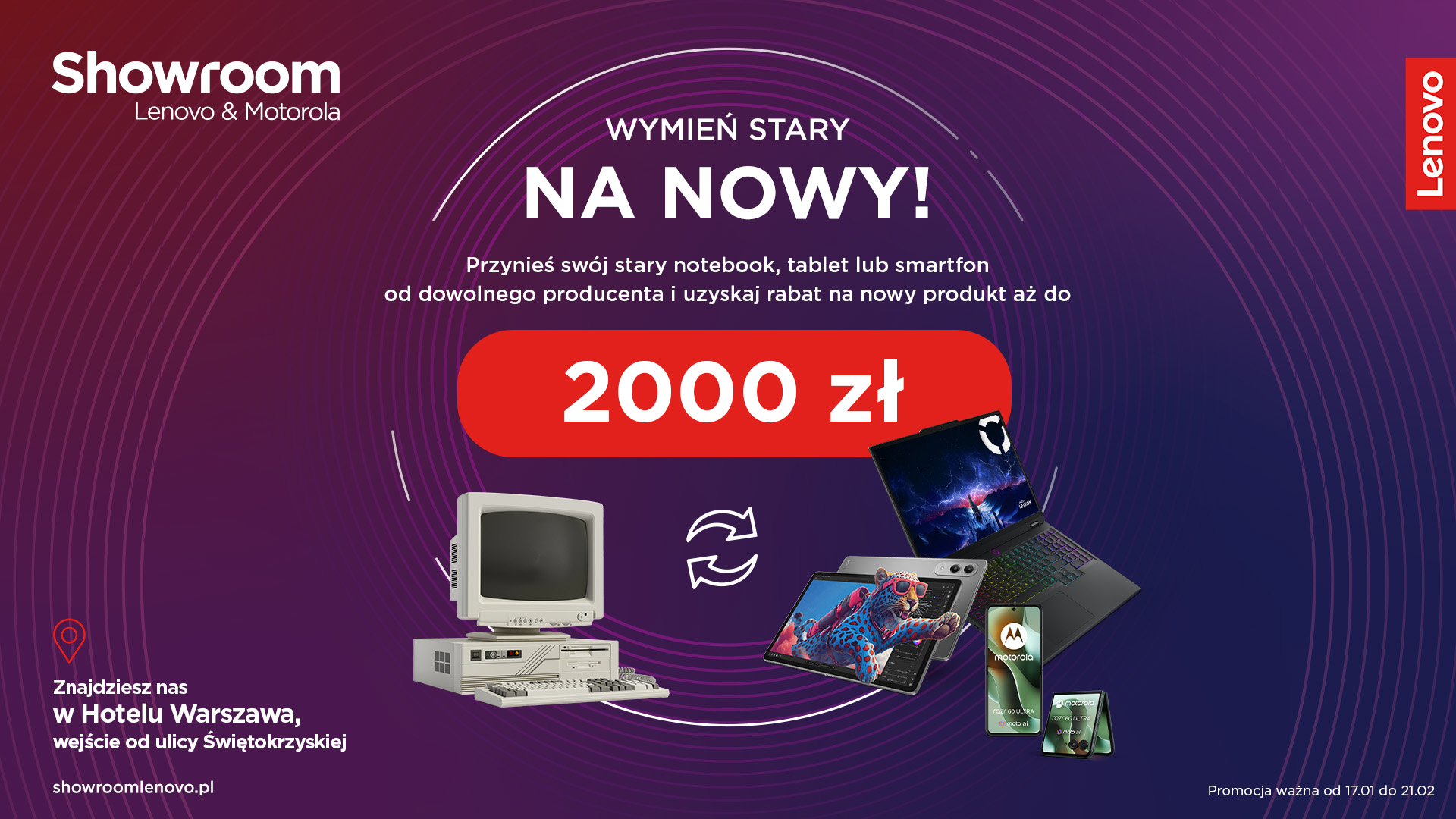 Warszawa, 16 stycznia 2026 r. – Nowy rok to idealny moment na wymianę urządzeń na nowe, dlatego Lenovo i Motorola przygotowały promocję z tej okazji. Do 21 lutego za przyniesienie do Showroomu Lenovo & Motorola w Warszawie dowolnego tabletu, notebooka czy smartfona można otrzymać rabat nawet do 2000 zł na zakup ich odpowiedników z bogatej oferty obu marek. Akcja „Wymień stary na nowy” jest skierowana do osób, które chcą cieszyć się najnowszą elektroniką i skorzystać z atrakcyjnych zniżek. To doskonała szansa na unowocześnienie swojego technologicznego wyposażenia przy jednoczesnym dbaniu o środowisko dzięki recyklingowi.