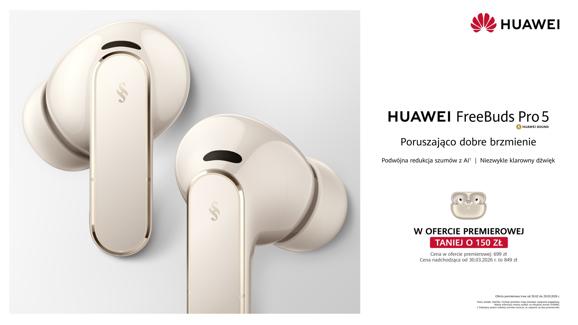 Rekomendowana cena HUAWEI FreeBuds Pro 5 wynosi 849 zł. Z okazji premiery, w okresie od 26 lutego do 29 marca 2026 r. kupujący mogą skorzystać z obniżki w wysokości 150 zł. Słuchawki dostępne są u Partnerów Biznesowych firmy: w sklepach sieci handlowych Media Expert, RTV Euro AGD, Media Markt, Neonet, x-kom i Komputronik, operatora sieci Orange, Play, Plus i T-Mobile oraz w oficjalnym sklepie huawei.pl i w strefie marki na Allegro. Kupujący w sklepie internetowym huawei.pl otrzymają dodatkowe, roczne wsparcie na wypadek zgubienia słuchawki – w trakcie trwania usługi (12 miesięcy) kupujący może jednorazowo skorzystać ze zniżki 50% na zakup nowej pojedynczej słuchawki HUAWEI FreeBuds Pro 5. Podane ceny są cenami rekomendowanymi. Oferta może różnić się w zależności od kanału sprzedaży oraz może ulec zmianie. Szczegóły ofert dostępne są u Sprzedawców.