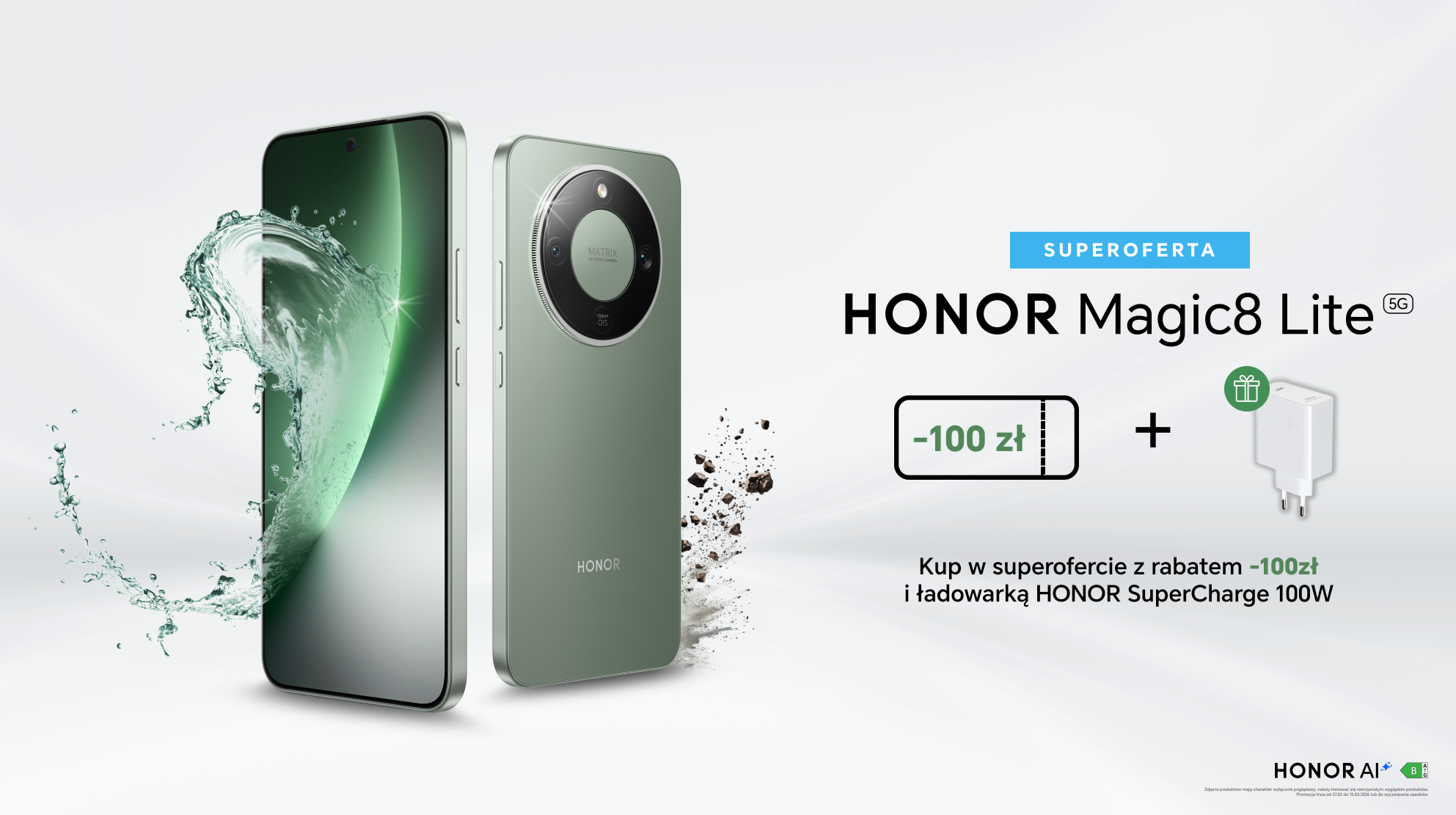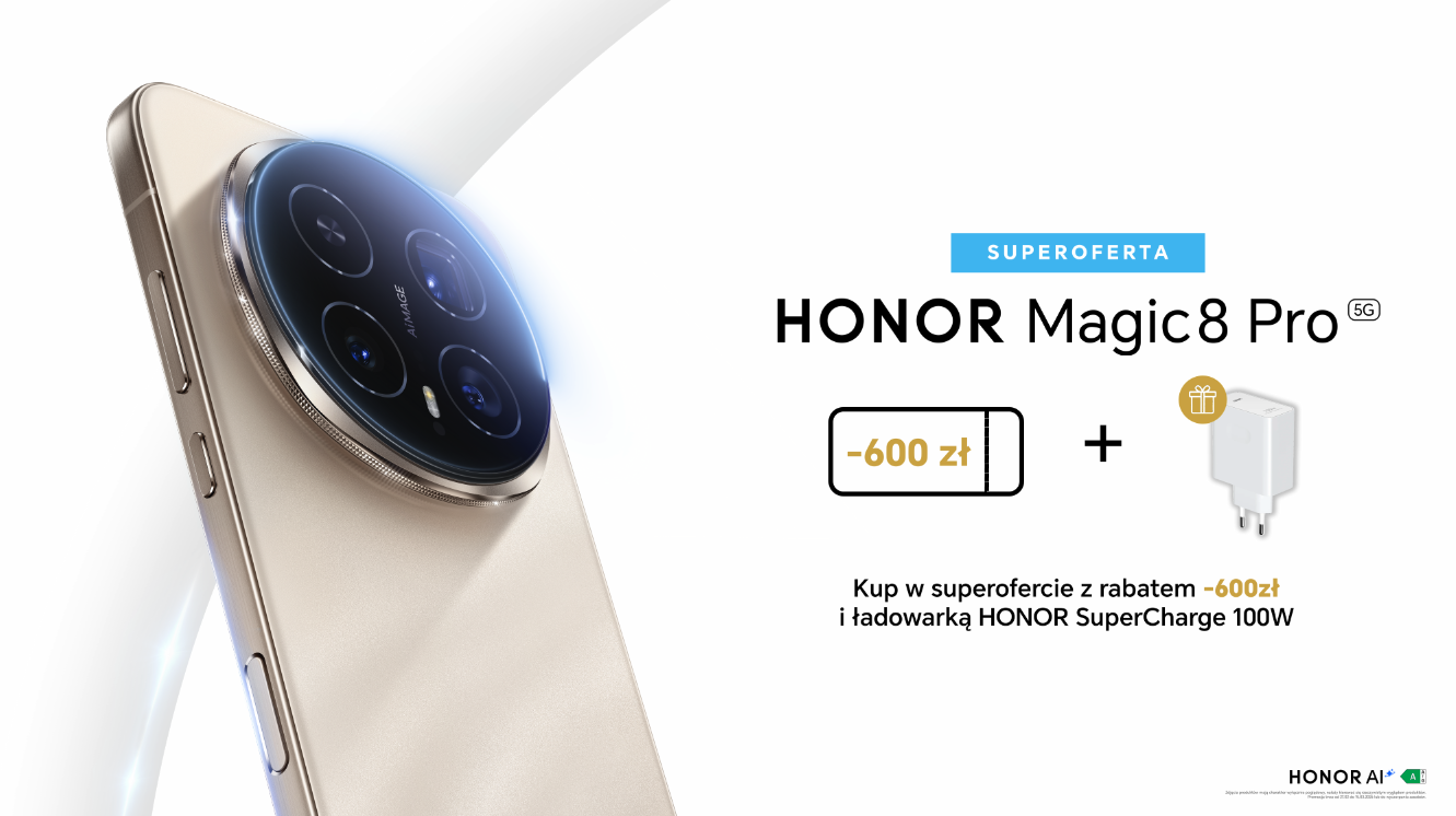 [Warszawa, 27 lutego 2026] HONOR ogłasza superofertę na smartfony HONOR Magic8 Lite oraz HONOR Magic8 Pro. Promocja potrwa do 15 marca i będzie dostępna w Honorstore.pl oraz u wybranych partnerów handlowych. W ramach oferty klienci mogą skorzystać z rabatu na zakup urządzenia oraz otrzymać w zestawie ładowarkę HONOR SuperCharge 100W.