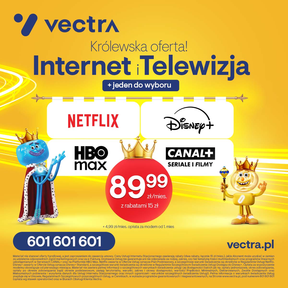 Vectra wprowadza „Królewską ofertę” – nowy pakiet łączący Internet światłowodowy do 300 Mb/s, telewizję z 73 kanałami oraz dostęp do jednej z platform streamingowych: Netflix, Disney+, HBO Max lub CANAL+. Oferta dostępna jest w cenie od 89,99 zł miesięcznie i wzmacnia segment pakietów łączących Internet, telewizję oraz streaming w jednej opłacie, odpowiadając na rosnące oczekiwania klientów poszukujących kompleksowych rozwiązań. Debiutująca „Królewska oferta” obejmuje Internet do 300 Mb/s, Pakiet Srebrny z 73 kanałami oraz unikalną możliwość wyboru jednego serwisu streamingowego. Klienci mogą zdecydować się na Netflix w pakiecie Podstawowym, Disney+ w pakiecie Standard, HBO Max w pakiecie Standardowym lub CANAL+ Seriale i Filmy. Całość dostępna jest w cenie 89,99 zł miesięcznie, przy 23-miesięcznym okresie zobowiązania. Oferta obejmuje również warianty z wyższymi prędkościami Internetu oraz bogatszymi pakietami telewizyjnymi do wyboru. W ramach nowej kampanii przygotowano także specjalną propozycję dla obecnych klientów. Przy zakupie dwóch serwisów streamingowych w pakiecie można zaoszczędzić 10 zł miesięcznie w porównaniu do ceny usług nabywanych oddzielnie. Do wyboru są zestawy: CANAL+ Seriale i Filmy z Netflixem w pakiecie Podstawowym za 52,99 zł miesięcznie, Netflix w pakiecie Podstawowym z Disney+ w pakiecie Standard w cenie 57,99 zł, Netflix w pakiecie Podstawowym z HBO Max w planie Standardowym za 62,99 zł lub Disney+ w planie Standardowym z HBO Max w pakiecie Standardowym za 64,99 zł. Komunikacja oferty ściśle związana jest z głośnymi premierami największych platform streamingowych. Na Netflixie króluje czwarty sezon uwielbianego przez widzów serialu „Bridgertonowie” a już wkrótce Disney+ udostępni swoim użytkownikom kontynuację jednego z największych animowanych hitów ostatnich lat, czyli „Zwierzogrodu 2”. W CANAL+ Seriale i Filmy od 23 lutego dostępny jest serial „Król i Zdobywca” a w serwisie HBO Max 6 marca swoją premierę będzie mieć polski serial „Piekło Kobiet”. Korzystając z oferty Vectry, widzowie mogą zobaczyć te premiery, a także uzyskać dostęp do obszernej biblioteki wybranego serwisu streamingowego.