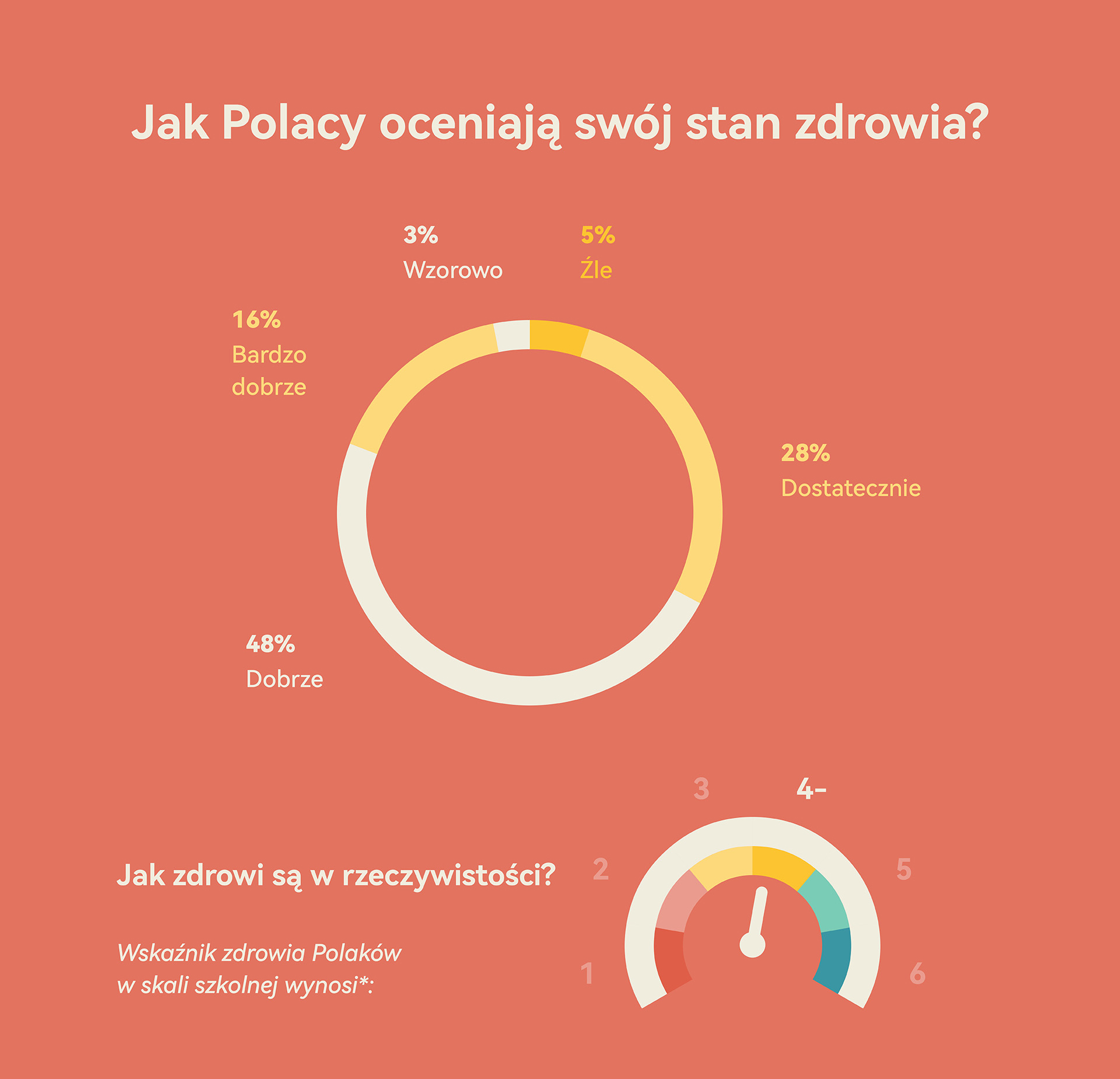 Wskaźnik zdrowia Polaków, obliczony na podstawie deklaracji dotyczących nawyków, wyników badań i dbałości o zdrowie, pokazuje, że niemal połowa badanych (48%) znajduje się w grupie o dobrym stanie zdrowia, a 43% – na poziomie średnim. Jedynie 5% Polaków odznacza się bardzo dobrym zdrowiem, a 4% – obniżonym. Tak duży udział „środkowej strefy zdrowia” pokazuje, że dobrostan Polaków najczęściej plasuje się na poziomie przeciętnym. Ma to swoje odzwierciedlenie w codziennych doświadczeniach – co drugi z nas odczuwa w ostatnim czasie brak energii w ciągu dnia (50%), ponad 4 osoby na 10 zmagają się na co dzień z problemami ze snem (43%), a także z podenerwowaniem (42%). Ponadto co trzeci Polak szybko męczy się nawet przy podstawowych czynnościach (33%) [ii]. To właśnie w codziennych nawykach – związanych m.in. z ruchem, snem i dietą – najlepiej widać źródła tych dolegliwości.