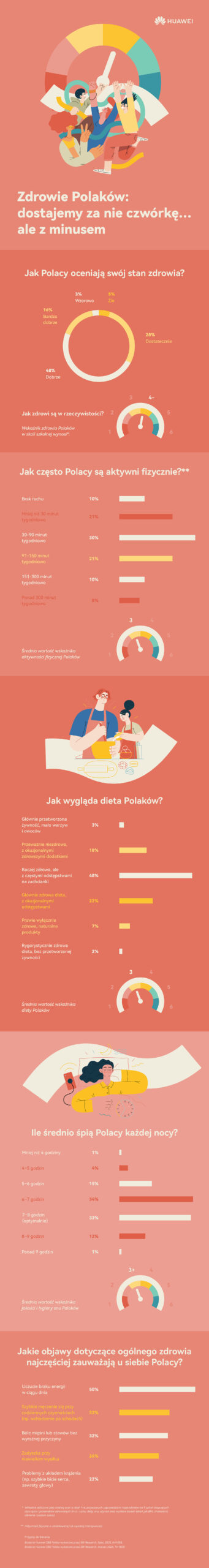 Warszawa,10 kwietnia 2026 r. – Choć niemal połowa z nas ocenia swój stan zdrowia jako dobry (48%), wyniki badań Huawei CBG Polska pokazują rzeczywisty obraz, który nie wygląda tak optymistycznie. W dbaniu o zdrowie ważne są odpowiednia aktywność fizyczna, dieta i sen – tymczasem blisko co trzecia osoba w Polsce (31%) prowadzi siedzący tryb życia, 20% często sięga po wysoko przetworzoną żywność, a co piąta śpi mniej niż 6 godz. na dobę (20%) [i]. Średnia wartość wskaźnika zdrowia Polaków wynosi 3,99 – odpowiednik szkolnej czwórki z minusem.