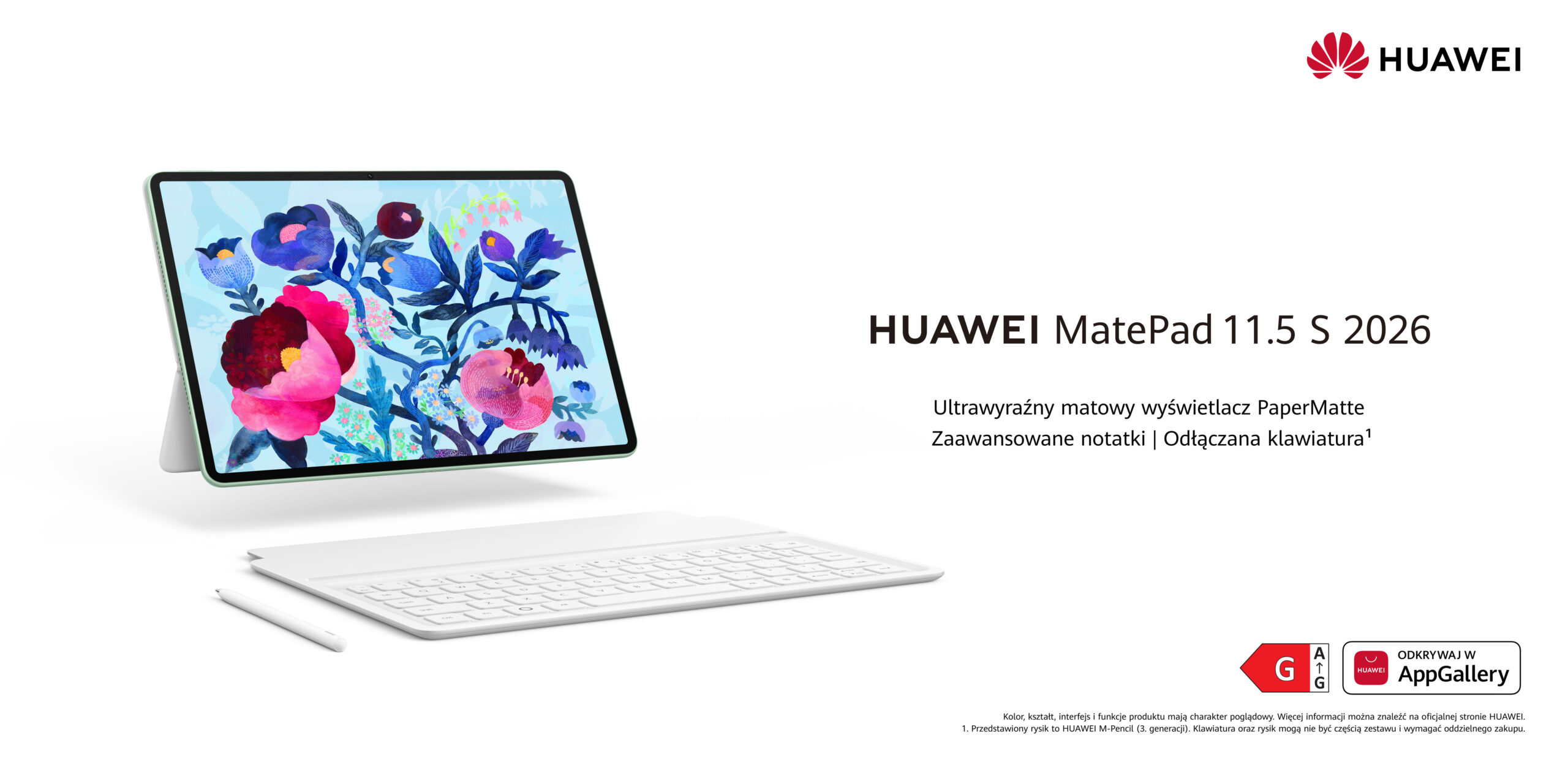 Huawei przedstawia ofertę na 2 tablety z matowym ekranem: HUAWEI MatePad 11.5 S 2026 oraz HUAWEI MatePad 11.5 2025. Nabywcy, w zależności od zestawu, otrzymają z tabletem także rysik i/lub klawiaturę. Oferta dostępna będzie u wybranych Partnerów Biznesowych i na huawei.pl do wyczerpania zapasów lub do 31.05.2026 r. HUAWEI MatePad 11.5 S 2026 wyposażono w 12 GB RAM i 256 GB pamięci wewnętrznej. Wyróżnia się wyświetlaczem z matową powłoką, która skutecznie rozprasza światło i zapewnia komfort pracy nawet w nasłonecznionych miejscach. Chropowata powierzchnia ekranu oraz szybka łączność NearLink ułatwiają precyzyjne korzystanie z rysika, co docenią osoby piszące i rysujące odręcznie. Za 1699 zł, wraz z tabletem, użytkownik otrzymuje klawiaturę HUAWEI Smart. A cena 1799 zł za zestaw, oprócz klawiatury, obejmuje także precyzyjny rysik HUAWEI M-Pencil 3. generacji.