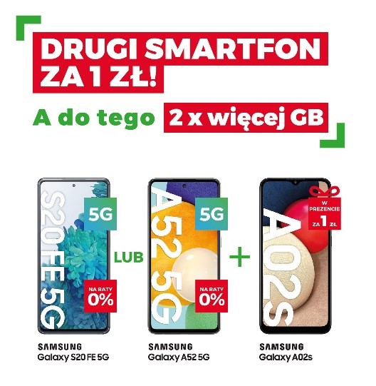 Przy zakupie smartfona Samsung Galaxy S20 FE 5G lub Samsung Galaxy A52 5G na raty z ofertą abonamentową klienci mogą dobrać drugi smartfon Samsung Galaxy A02s za 1 zł. Samsung Galaxy S20 FE 5G dostępny jest za 2 zł na start i np. 36 rat po 89 zł za sprzęt, a Samsung Galaxy A52 5G można nabyć za 2 zł na start i np. 36 rat po 53 zł za sprzęt. Z promocji mogą korzystać zarówno klienci indywidualni, jak i przedsiębiorcy.